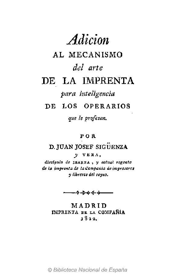 Adicion al mecanismo del arte de la imprenta para inteligencia de los operarios que le profesan.por D. Juan Josef Sigüenza y VeraReal Compañía de Impresoresy Libreros del Reino, 1822