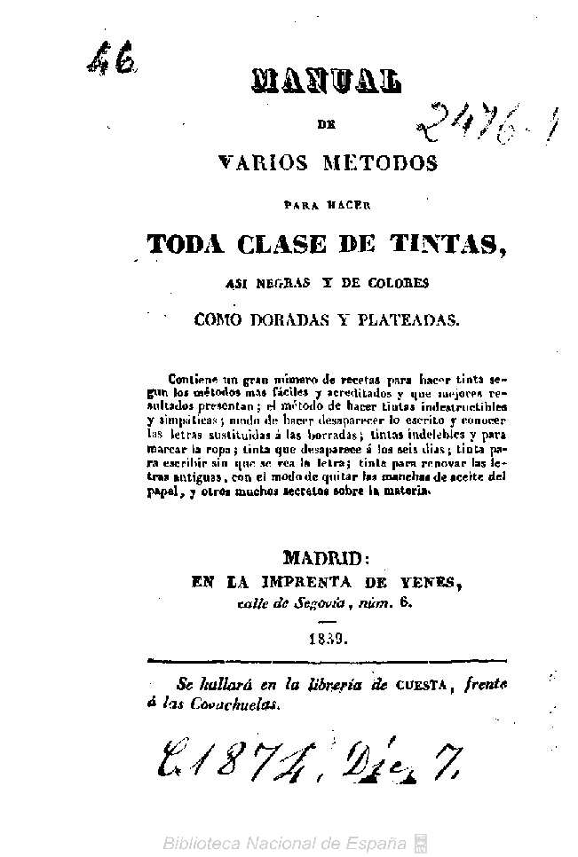 Manual de varios métodos para hacer toda clase de tintas, así negras y de colores como doradas y plateadas.Madrid: Imp. de Yenes 1839