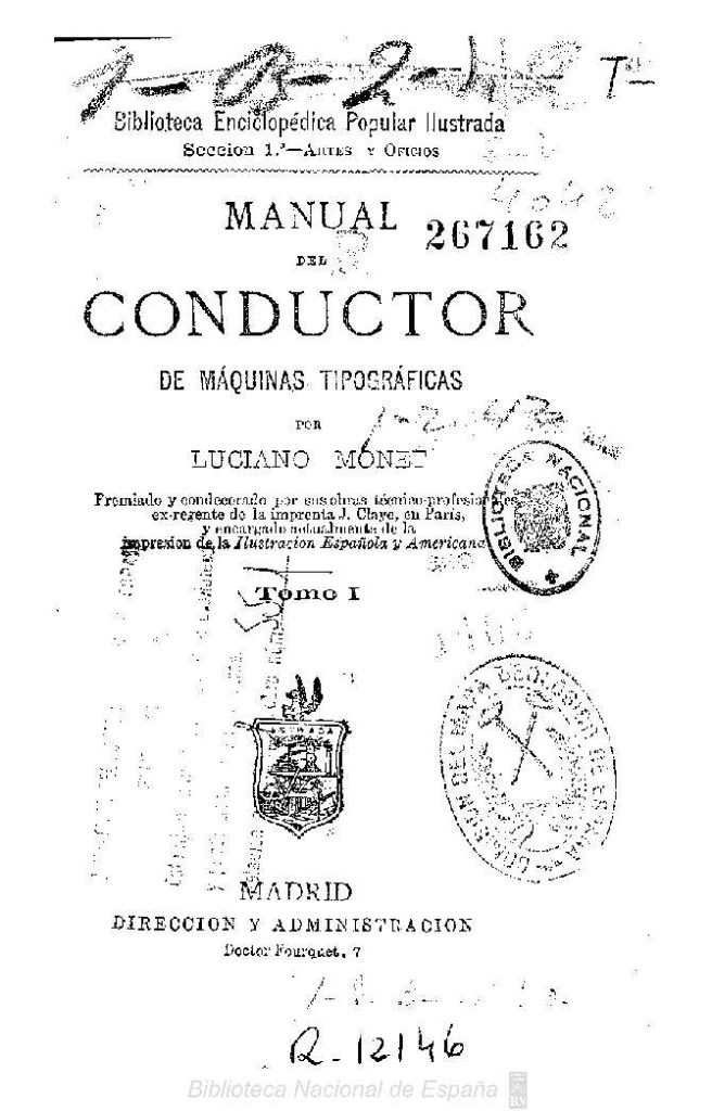 Manual del conductorde máquinas tipográficaspor Luciano MonetMadrid: Tip. de G. Estrada 1879