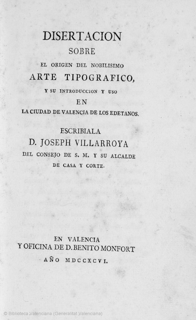 Disertacion sobre el origen del nobilísimo arte tipográfico, y su introducción y uso en la ciudad de Valencia de los… (1796)Villarroya, José, 1732-1804